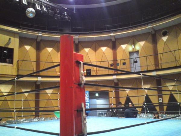 観衆が見守る中、リングに上がりスポットライトを浴び